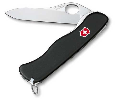 From Victorinox comes the famous Swiss Army line of pocket knives. While most Swiss Army knifes contain a multitude of tools, the Sentinel only holds a single blade. The 3" blade comes in both plain and serrated versions and is opened using a generous thumb hole. In fact, unlike the Opinel, the Victorinox Sentinel can be opened one handed. (Correction: Victorinox could not resist adding a few "extras" and in the hard polymer handle you will find a pair of tweezers and a tooth pick!)