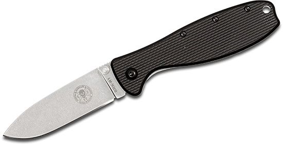 Ka-Bar is known for their WWII combat knife. Now you can get a Ka-Bar for your pocket. The Ka-Bar Dozier sports a 3" drop point blade in AUS-8A steel. The hollow ground blade is immensely useful and at .11" thick is built like a tank. It is more of an outdoor working knife than a delicate every day folder. The only thing missing is the blood groove.